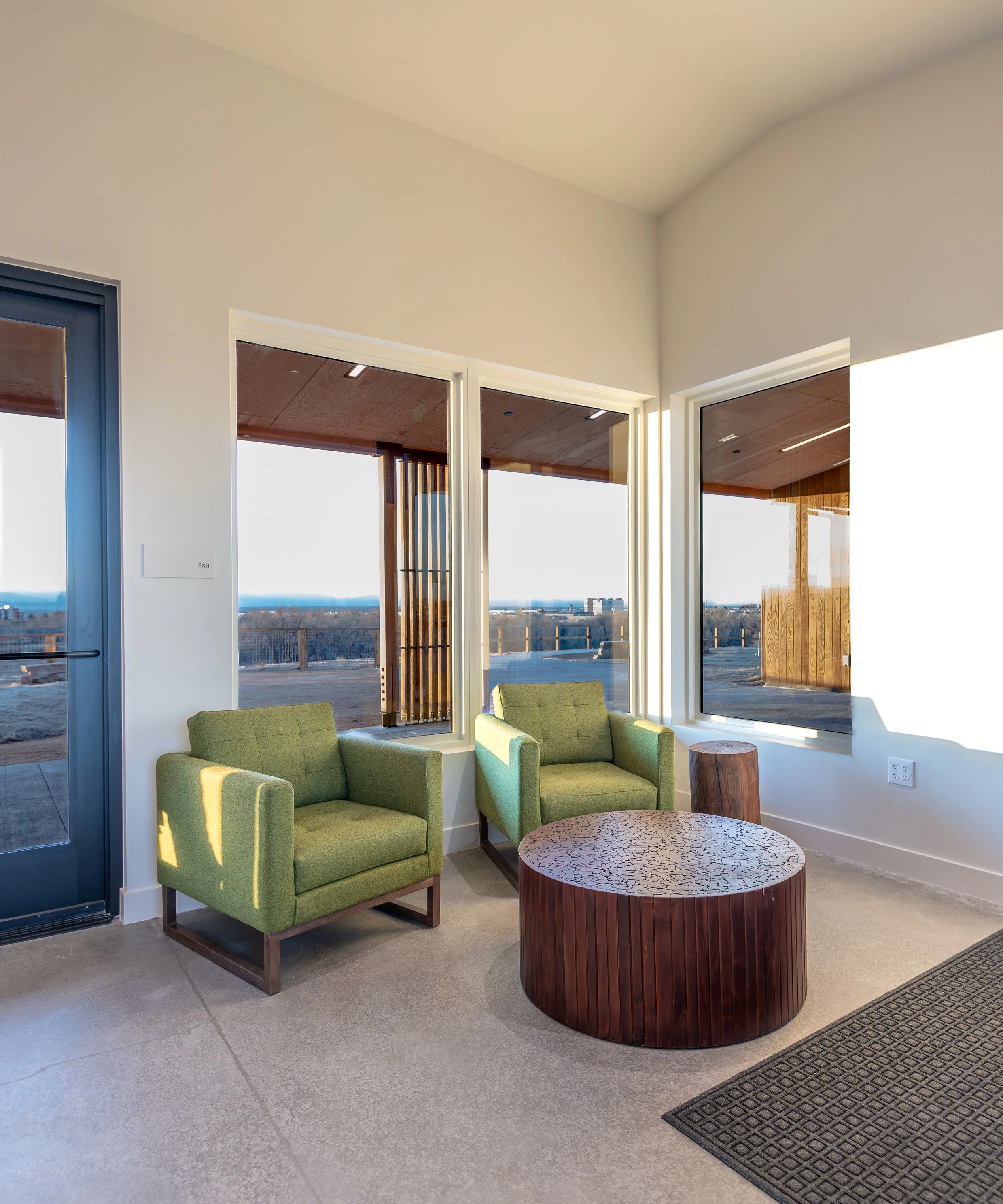 The southern, public building includes two classroom spaces that are designed to function independently or combine into a larger multipurpose room, with expansive views overlooking the lake below and the mountains beyond. Adjacent sink and storage areas support art-making and hands-on education/ research, while a new outdoor classroom beneath generous roof overhangs provides shaded space for lab work and group learning. An indoor-outdoor lobby welcomes visitors and offers seating for individuals and groups who may not continue down to the lower landscape and pond.