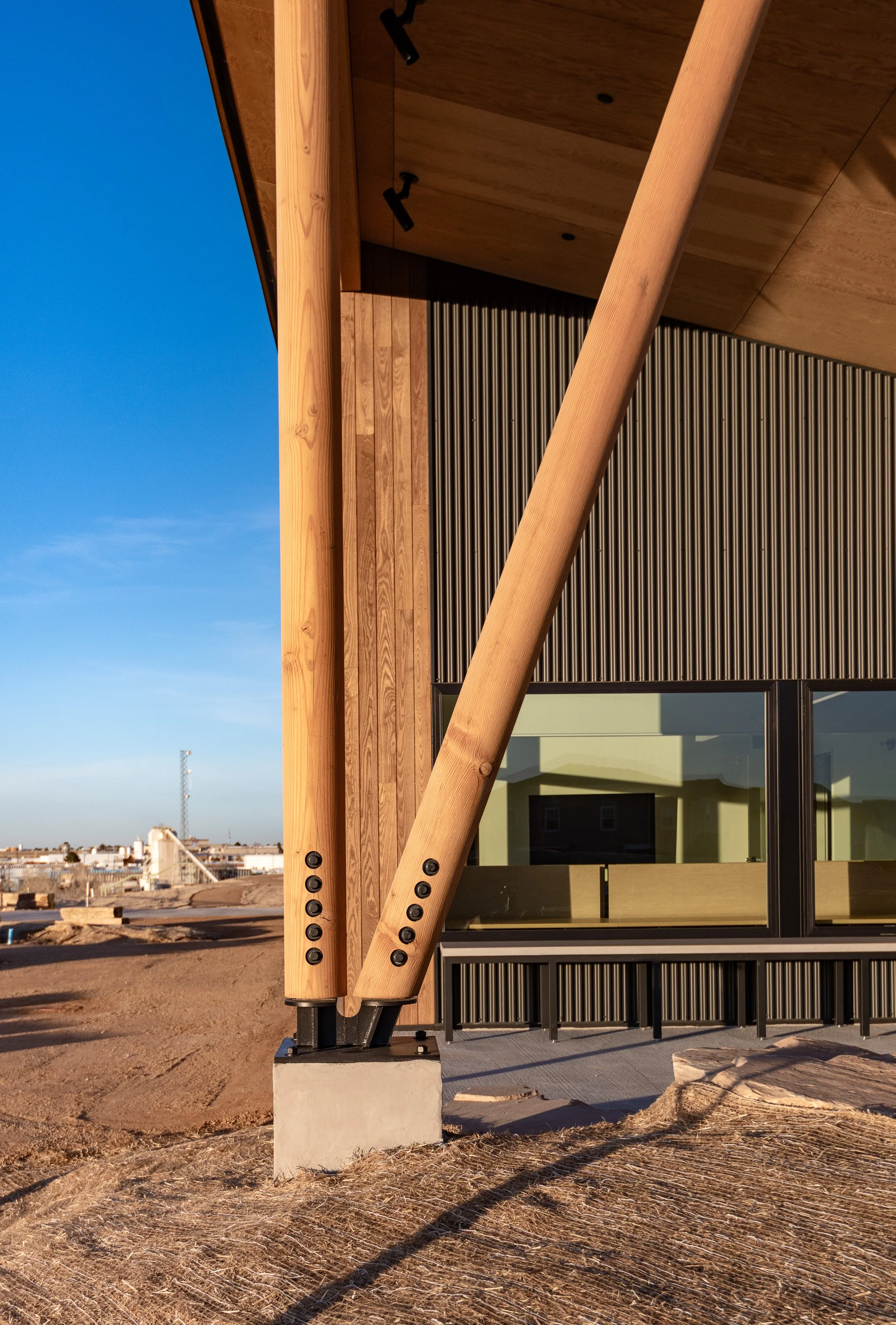 Conceived as a gateway to the larger landscape, the building draws visitors through its form and outward toward the site beyond. The building is organized as two volumes connected by a covered passage that acts as a gateway, guiding guests into the nature center while providing a sheltered waiting area, clear wayfinding, and space for interpretation and information. Large overhangs extend the usable space of the building, creating outdoor learning and gathering areas while supporting photovoltaic panels that help meet the project’s net-zero energy goals.